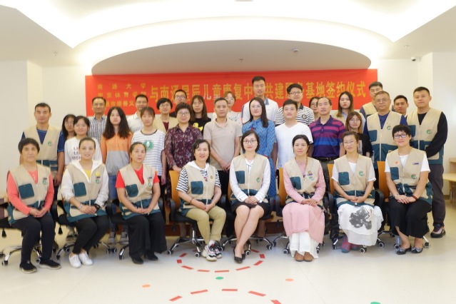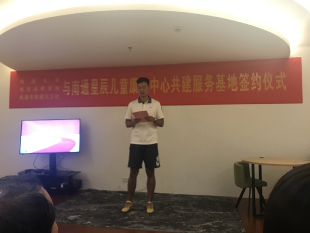 为深入贯彻习近平总书记在“不忘初心,牢记使命”教育工作会议上的重要讲话精神,进一步将2019年江苏省大学生志愿者暑期文化科技卫生“三下乡社会实践落到实处,也为继承和发扬南体“严和朴实”的校训,促进运动训练学院学生社会实践工作常态化、机制化,受南通星辰儿童康复中心邀请,运动训练学院党总支副书记杜家俊、运动训练学院辅导员、南体添翼天使暑期社会实践团队带队教师刘宸、团队代表周明晋参加了共建社会实践基地签约挂牌仪式。
