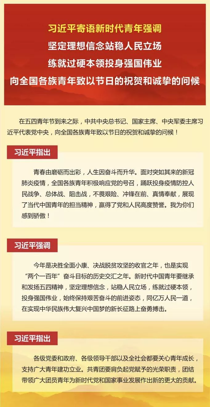 在五四青年节到来之际,习近平总书记寄语新时代青年,为广大青年提出目标要求、指明前进方向,激励他们在决胜全面小康、决战脱贫攻坚的收官之年,在实现“两个一百年”奋斗目标的历史交汇之年,作出新的更大的贡献。