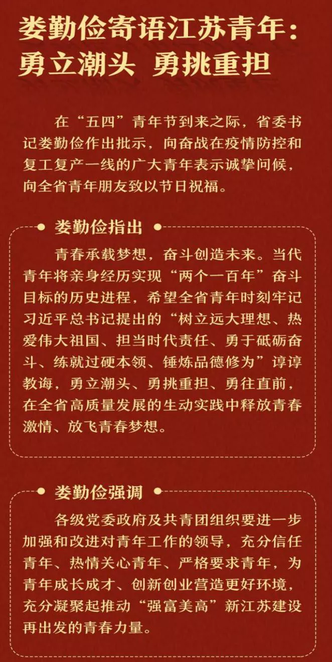 传承五四精神,绽放青春力量在五四青年节到来之际,习近平总书记寄语新时代青年时强调,新时代的青年要坚定理想信念站稳人民立场,练就过硬本领投身强国伟业。省委书记娄勤俭也寄语江苏青年,他指出,青春承载梦想,奋斗创造未来。青年要勇立潮头、勇挑重担。