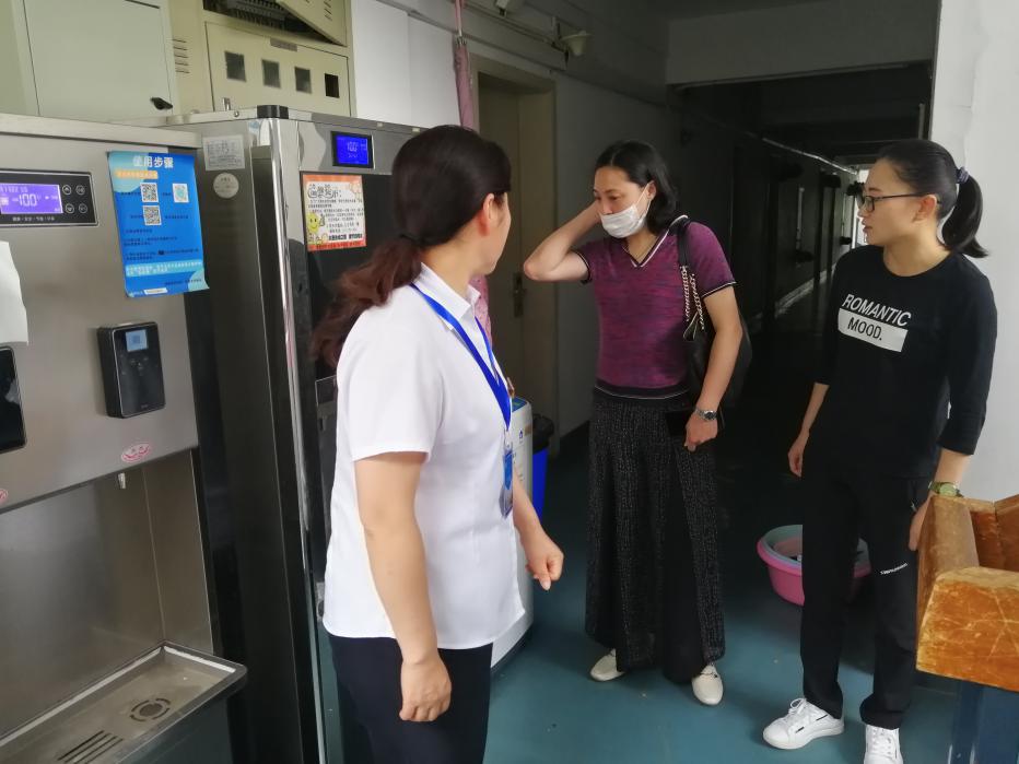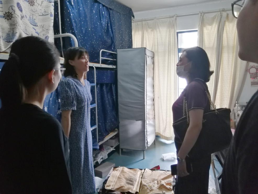 喻菊向宿管人员了解宿舍情况