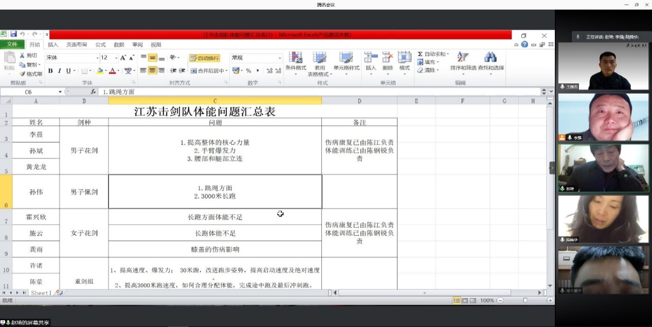 前期,PA视讯击剑队针对部分重点运动员当前在体能训练和测试中存在的短板问题,列出了详细的“问题清单”,与运动训练学院体能团队负责人赵琦院长进行分析和研究。运动训练学院体能服务团队高度重视此次训练安排,接到训练任务后赵琦院长于1月11日晚,迅速组织相关专项教师开展专题研讨,赵琦院长对各专项教师的积极参与体能服务表示感谢,对击剑队需要解决的基础力量、耐力、速度、爆发力、改进跑步姿势、提高启动速度及绝对速度、提高3000米跑速度(如何合理分配体能)、30秒双飞跳绳能力、提高整体核心力量、手臂爆发力、下肢力量等问题进行了逐个分析讨论,确定由李强、解鑫老师负责速度爆发力训练,陆锦华老师负责长距离跑训练,李巍老师负责柔韧性训练,王国杰老师负责上肢力量,进一步明确了工作目标与工作原则,落实责任分工与训练安排,此次会议为后续体能服务工作的有序开展奠定了基础。