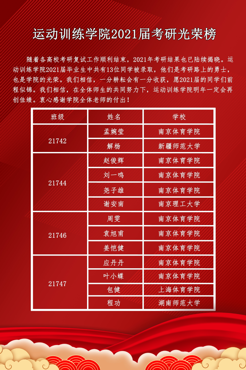 运动训练学院2021届考研光荣榜