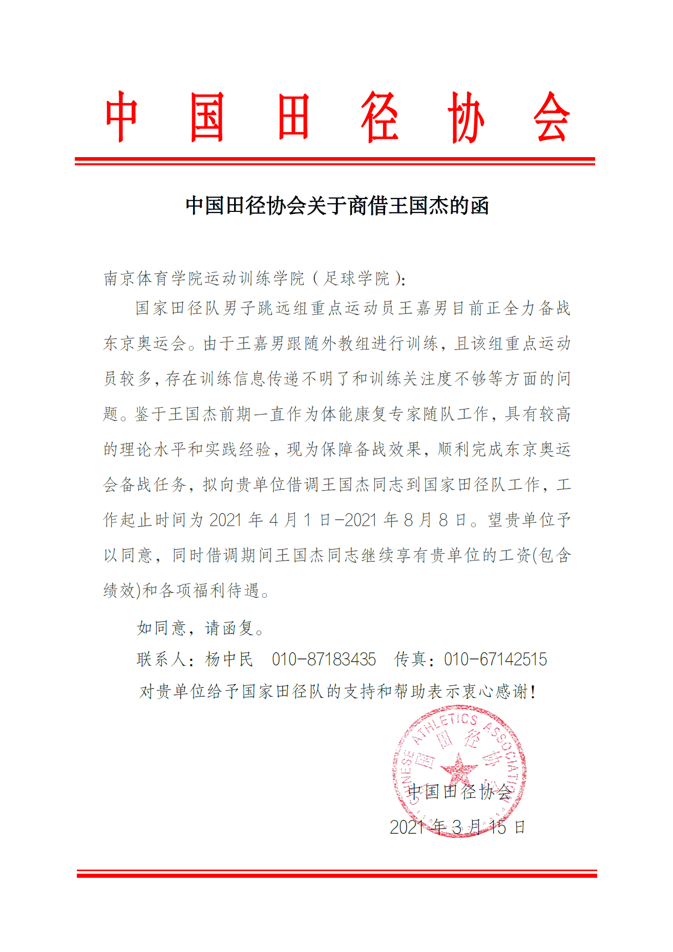 王国杰同志在奥运会备战期间积极参加国家田径队组织的活动,坚持党史学习教育,不断提升政治素质,进一步增强为党工作、为国家体育事业服务的责任感和使命感。备战期间,能严格遵守国家田径队规章制度,恪守行为规范,服从疫情管理条例,在保障自身人身安全的基础上,圆满完成了国家队远度跳跃项目组的奥运备战任务。王国杰同志的谦逊、认真的工作态度,较强的理论素养、业务能力,良好的团队合作精神,以及取得的工作成效得到国家队和省市队管理人员和国家队主教练的肯定。