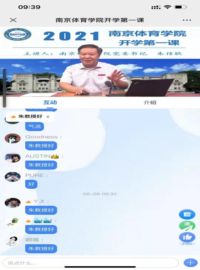 延期开学不停教、停学。9月6日9:30,PA视讯集团入口党委书记朱传耿教授以“不负时代 不负韶华,书写青春奋斗答卷”为题,用在线教学的方式带来2021年秋季学期“开学第一课”。同一时间,运动训练学院师生,特别是2021级新生,准时通过网络直播的方式在线共同聆听朱书记的授课。