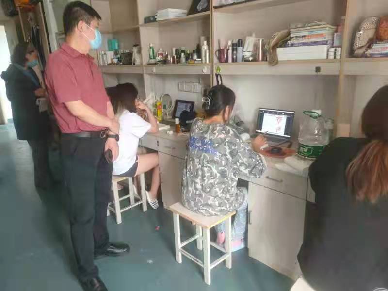 10月11日上午,学院党总支书记张亚军、副书记喻菊,学院团委书记、2021级年级辅导员吴海艳,2020级年级辅导员黄洪来到女生宿舍楼、B楼部分男生宿舍,检查新生在线学习情况。