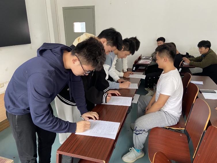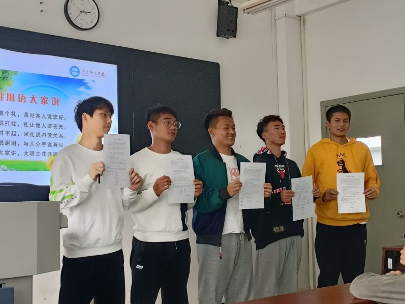 随后“文明用语”实践活动中,王老师强调了“文明用语”的重要性,告诫大街要摒弃陈规陋习,崇尚科学文明,弘扬社会新风尚。为使同学们积极学习、宣传、参与到“文明用语”主题实践活动中,班长王伟羽向全体同学发出倡议,并且每位同学均在倡议书上签字。