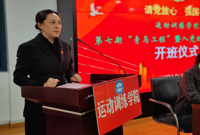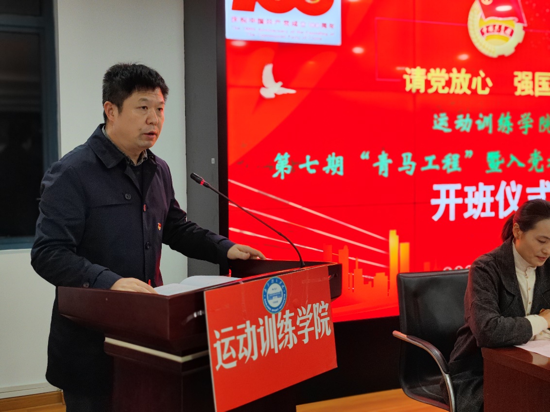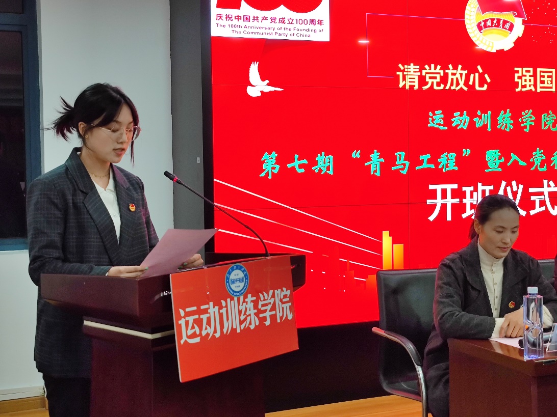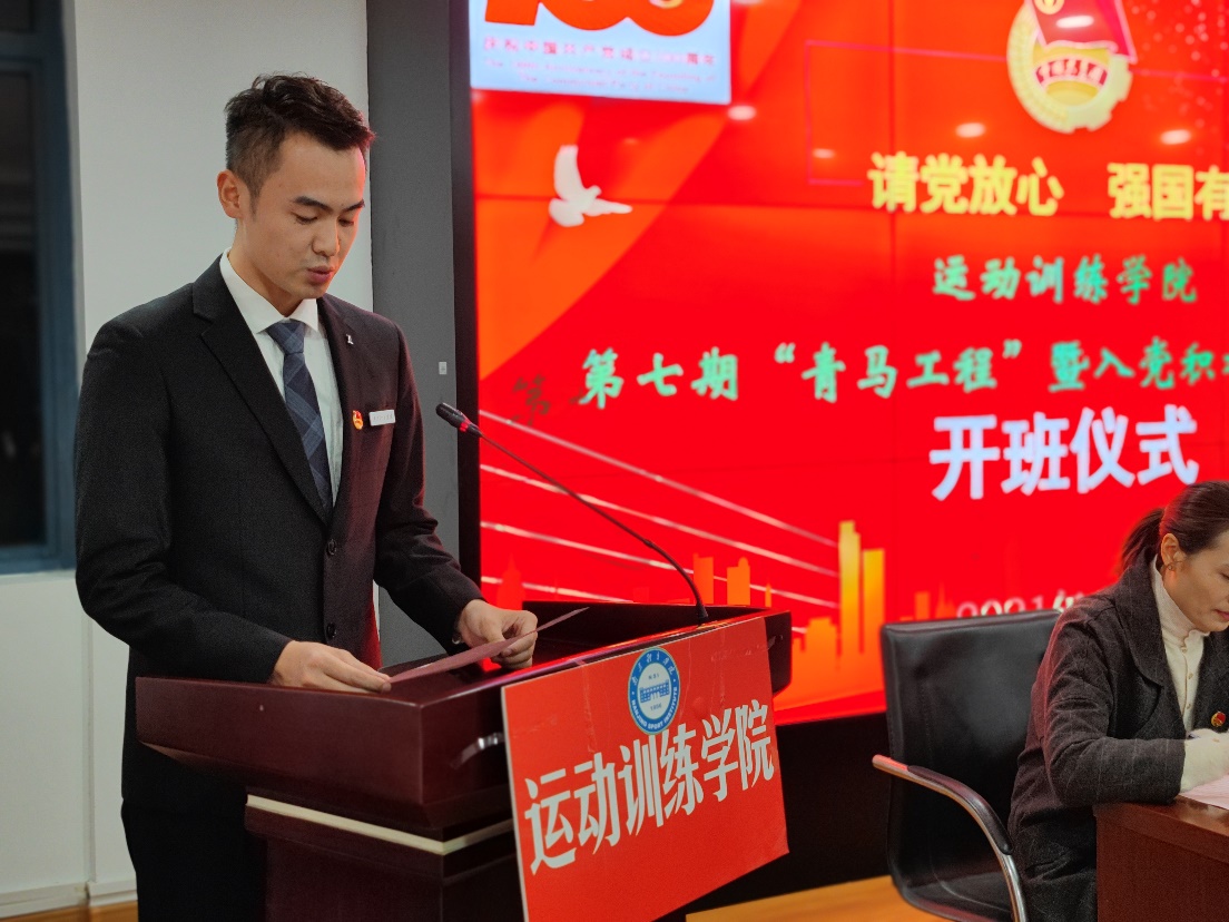 运动训练学院第六期青马班优秀学员、预备党员谢洪胜和本期学员代表王语馨先后发言。开班仪式在嘹亮的团歌声中结束。在授课环节,葛翠柏老师为全体学员讲授题为“为青春引路,与信仰同行”青马第一课。