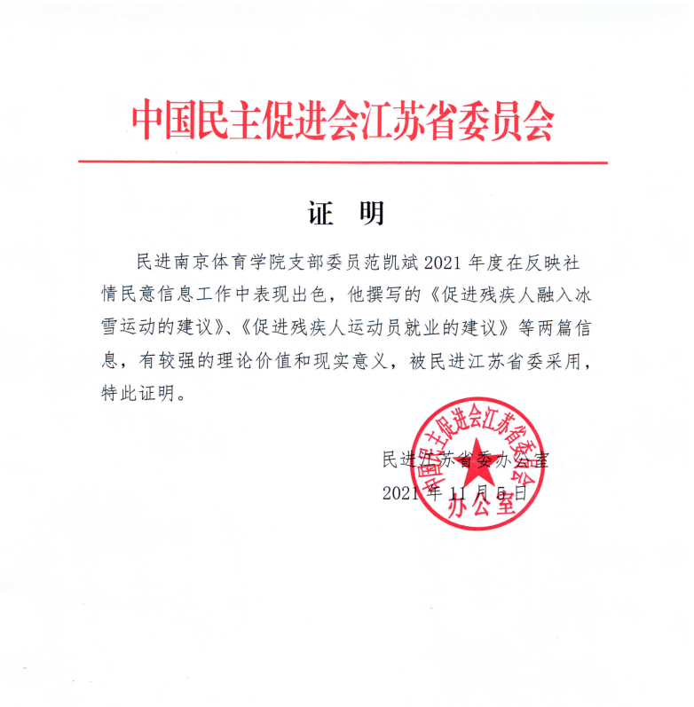 近日,中国民主促进会江苏省委员会特发证明:“民进PA视讯集团入口支部委员范凯斌2021年度在反映社情民意信息工作中表现出色,他撰写的《促进残疾人融入冰雪运动的建议》、《促进残疾人运动员就业的建议》等两篇信息,有较强的理论价值和现实意义,被民进江苏省委采用”。