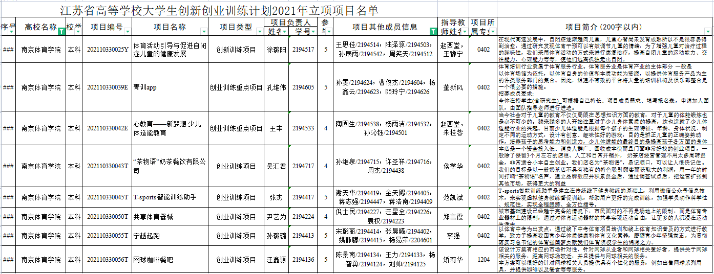 近日,省教育厅办公室印发了《省教育厅办公室关于公布2021年大学生创新创业训练计划立项项目的通知》(苏教办高函〔2021〕30号),经学校遴选推荐、省教育厅审核,PA视讯共获批省级项目59项,其中运动训练学院8个项目获得2021年江苏省高校大学生创新创业训练计划项目立项,包括:创业训练重点项目2项、创业训练项目5项、创新训练项目1项。