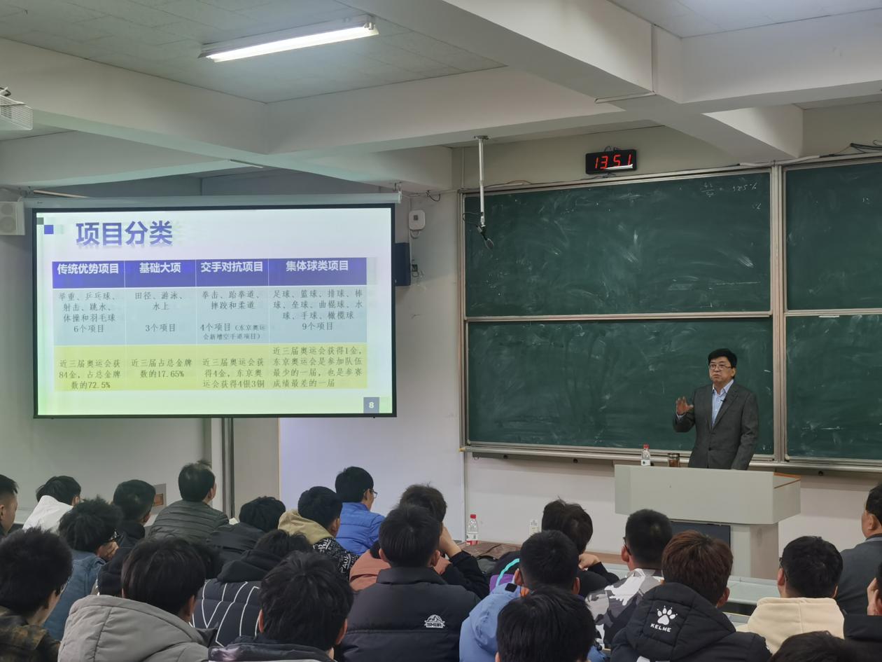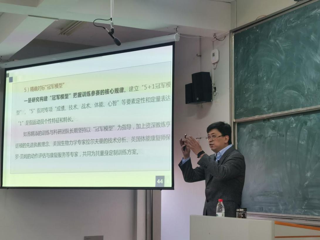 12月10日下午,杨国庆校长走进实验教学楼第四阶梯教室,为230余名本科生和研究生讲授了一堂题为“从东京到巴黎:中国备战参赛东京奥运会的制胜优势与经验启示”的运动训练学前沿公开课。