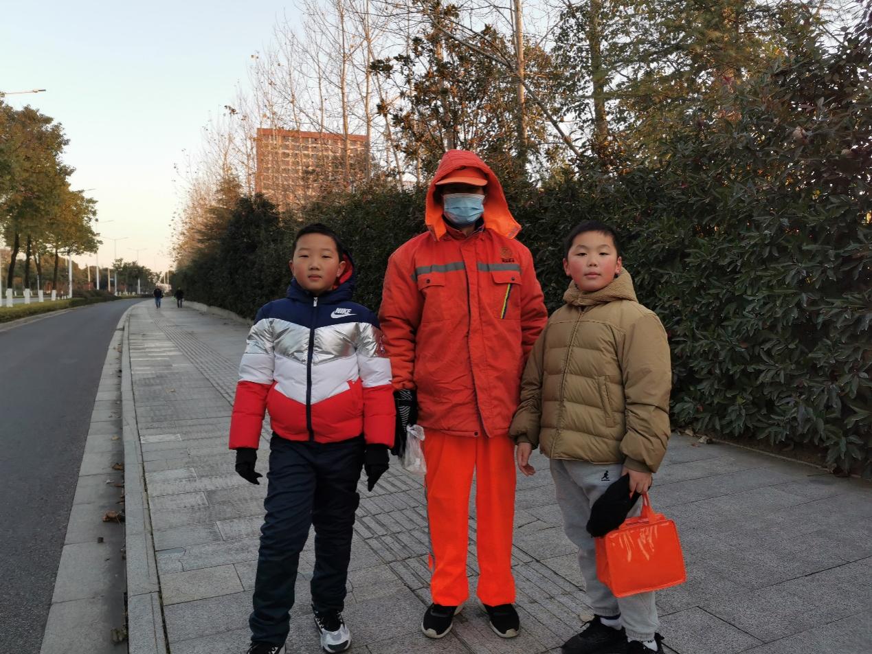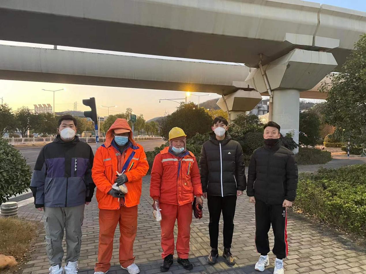 六点刚过,奥运冠军黄旭携同家人早已在仙林校区西门等候。在与志愿者交流的过程中,黄旭先生表示:这是他第三次参加这个活动了,也正是有了像我们这样一群有爱心的人,才使这个冬天多了一份温暖。他对“暖冬行动”非常肯定,同时他还鼓励志愿者们要坚持下去,能够在寒冷的冬天从被窝里爬起来,足够说明我们志愿者有坚强的意志力。他表示今后还会持续关注这个活动并积极加入,并支持自己的小孩成为此次活动的小志愿者。随后,黄旭与志愿者一同踏上了寻找环卫工人的路途。
