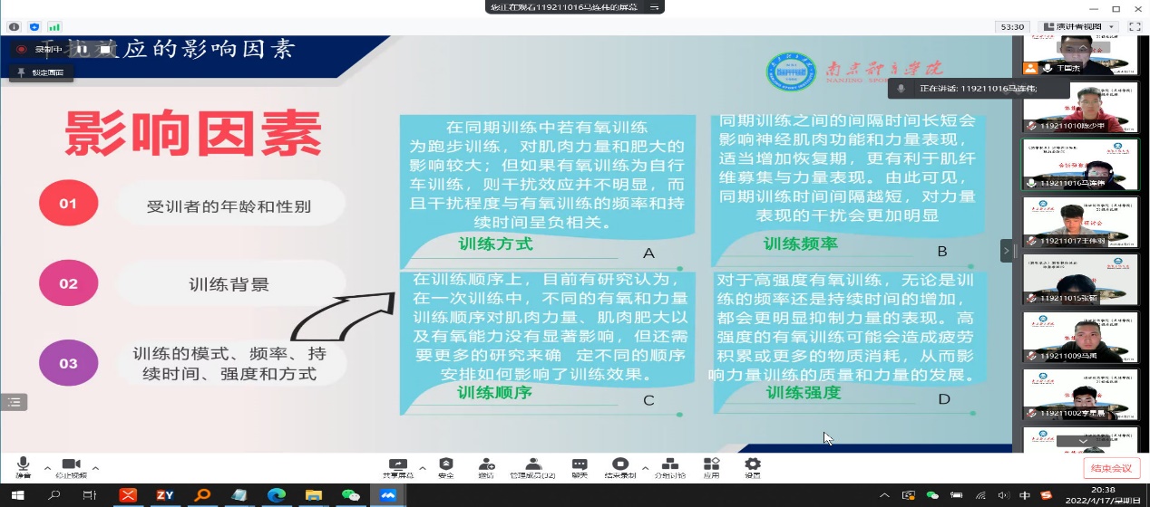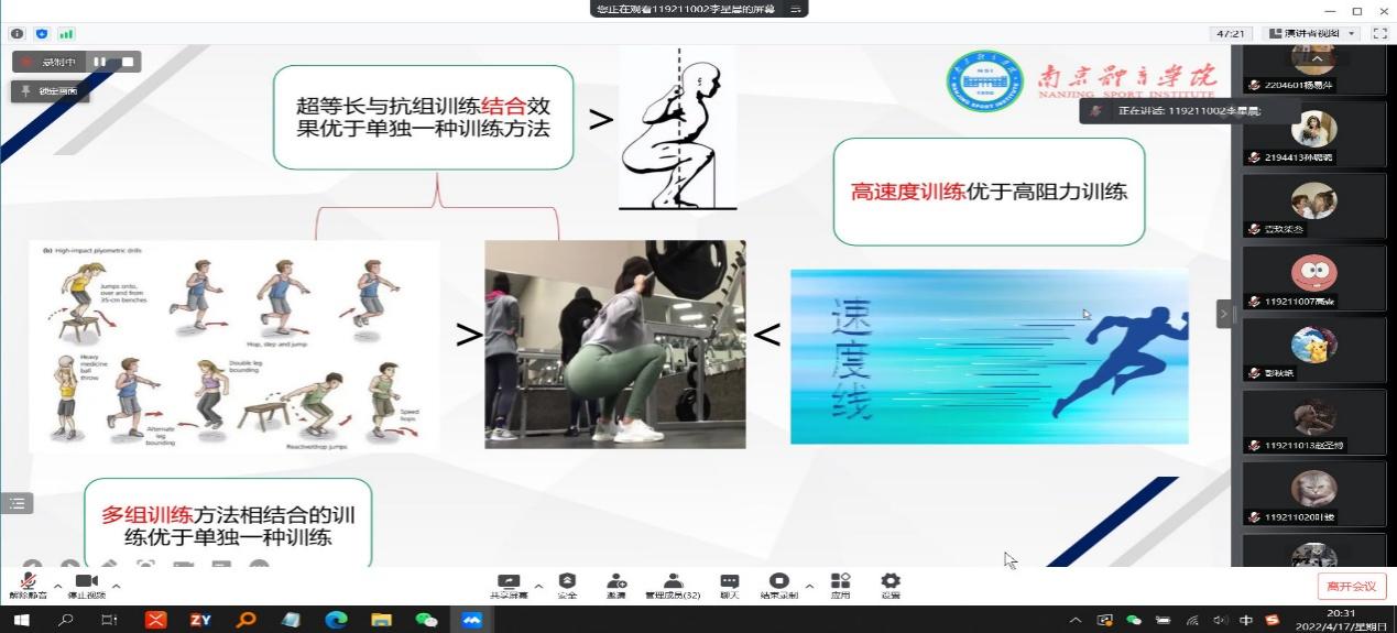 为提升体能专业培养质量,调动疫情封闭管理状态下学生的学习热情,形成“爱学习、擅学习”的学风,119211班于4月17日晚间开展了线上研讨交流活动。前期本着自主申请和自愿参与的原则,共8位同学提交了学习设想和发展规划。本次线上研讨活动,8位同学做限定题目下5-7分钟汇报,最终根据表现水平,选拔5位同学成立强化小组,后期重点围绕竞技体能训练和运动表现分析开展针对性辅导,目标是:1.帮助学生提高专业能力、培养科学素养;2.为学生后期申请大学生创新项目、从事科学研究、发表期刊打好基础;3.为考研预备、辅助科研项目攻关服务做好准备。助力学院专业、学科建设。