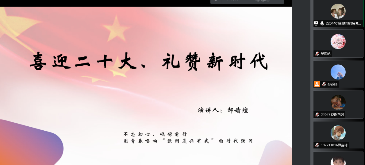 为迎接党的二十大顺利召开,进一步聚集思想引领主责主业,团结引领学院团员青年坚定信念跟党走,勇做走在新时代新征程奋进者,运动训练学院于4月17日举办“喜迎二十大、永远跟党走、奋进新征程”团干部思政技能大比武活动,以线上腾讯会议的形式进行,参与人员有学院党总支副书记喻菊、学生工作办公室副主任孙苏扬、运动训练学院全体辅导员和班级团支书、团干部。活动由团委副书记吴海艳主持。