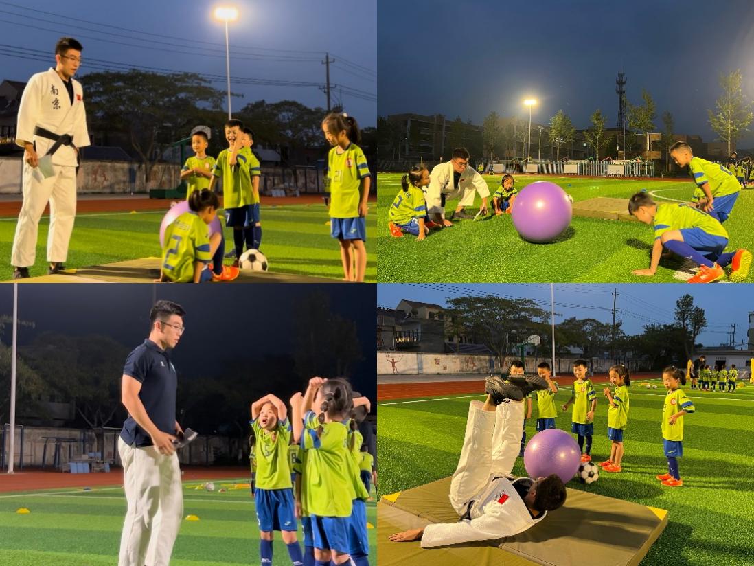 (二)“翻滚吧”少年:支教队员指导小球员模仿柔道运动员倒地自我保护练习,目的是提高小球员在足球训练中的自我保护意识。通过头顶球游戏,模拟倒地的情境,减少训练中受伤的风险。