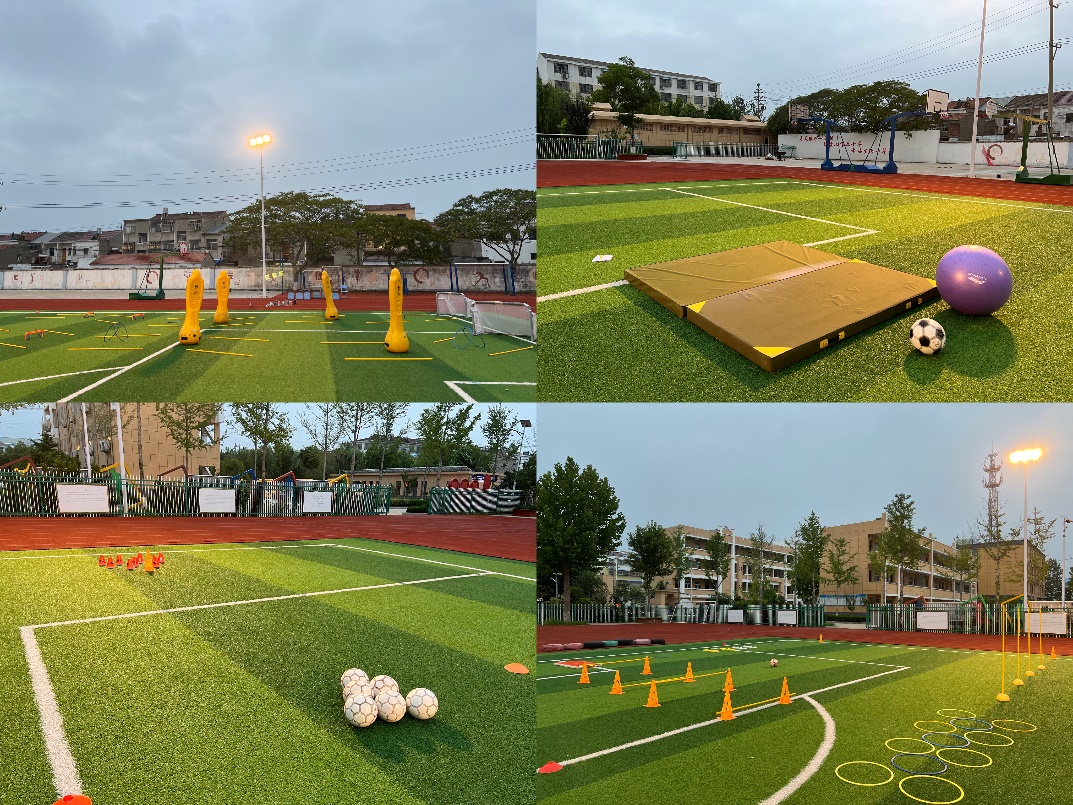 (一)“穿越火线”。利用不同样式的标志物与障碍物,模拟比赛中情境,指导小球员依次带球通过,锻炼孩子们的身体协调性与灵敏性。