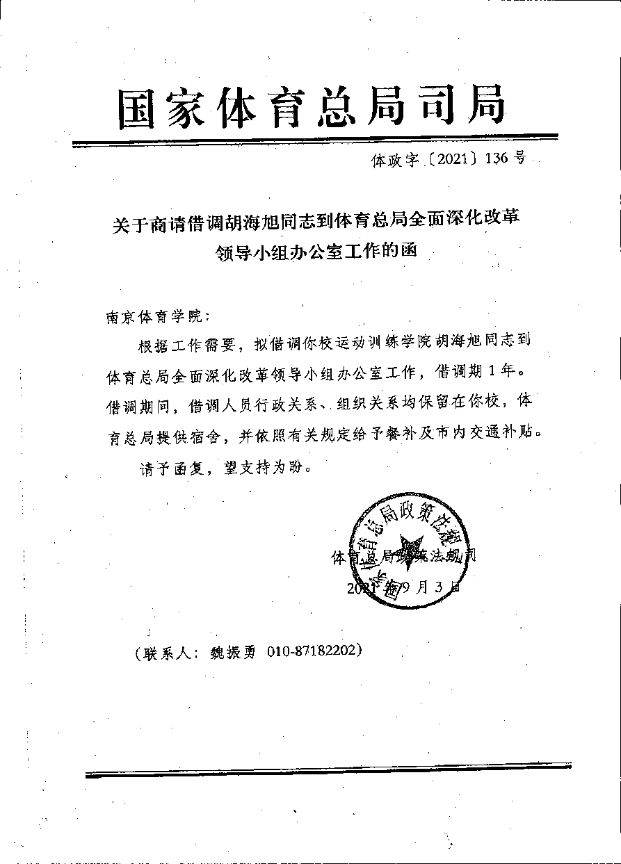 根据国家体育总局工作需要,PA视讯选派胡海旭博士于2021年9月至2022年8月借调至国家体育总局全面深化改革领导小组办公室协助工作。借调期间,胡海旭博士积极参与了《习近平关于体育工作论述摘编》《深入学习习近平关于体育的重要论述》等重要文稿的修改完善工作;承担体育项目目录整理以及《体育法释义》《体育工作情况》编辑校对工作;起草了东京奥运会相关问题研究、体育经纪人研究等研究报告。胡海旭博士认真负责的工作作风、务实严谨的学风、低调朴素的个人修养得到了总局政策法规司领导和同事的一致肯定。