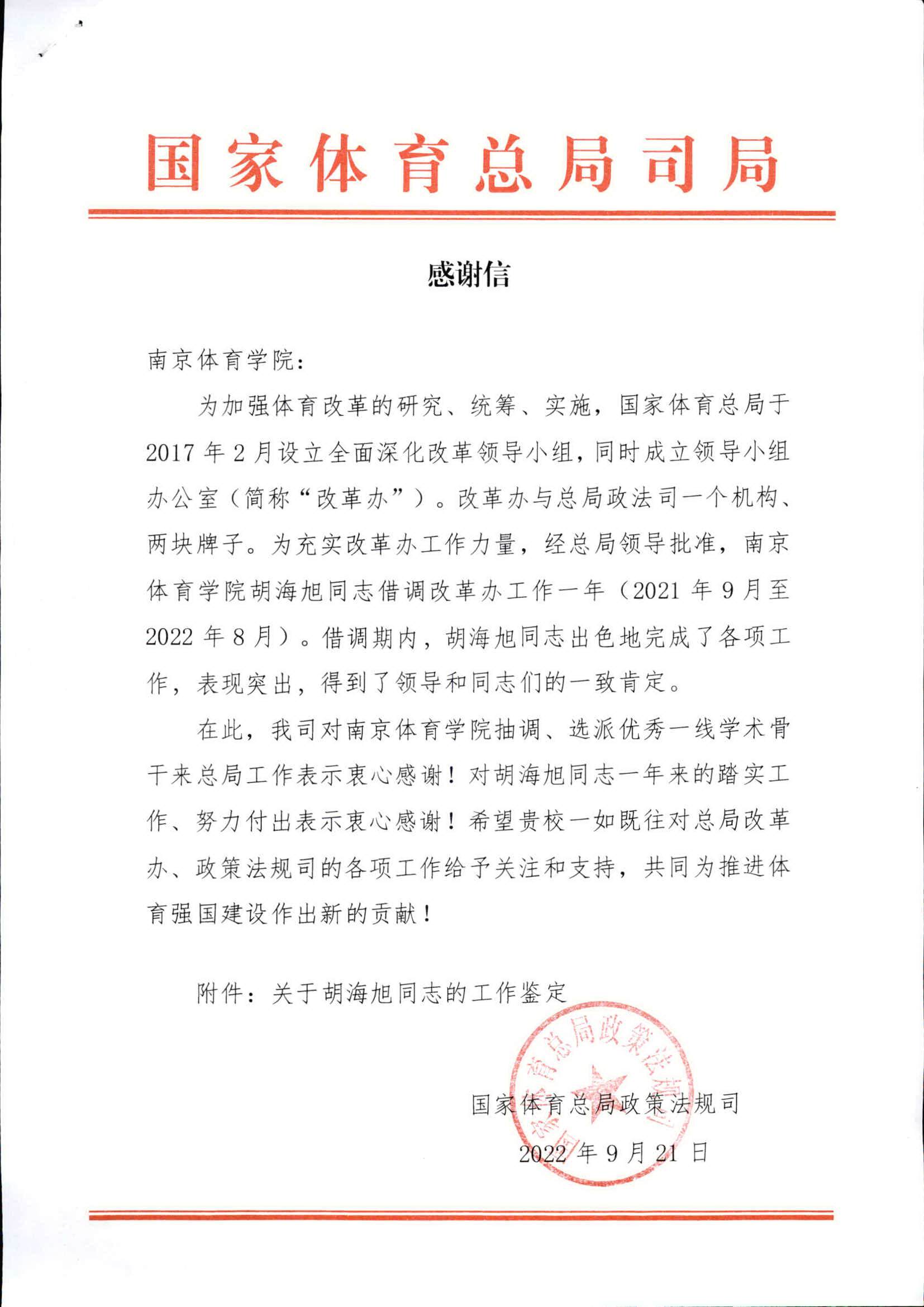 近日,国家体育总局政策法规司向PA视讯发来感谢信,对PA视讯运动训练学院副教授胡海旭博士在国家体育总局借调一年期间的出色表现给予充分肯定,并对PA视讯选派学术骨干到总局工作表示感谢。