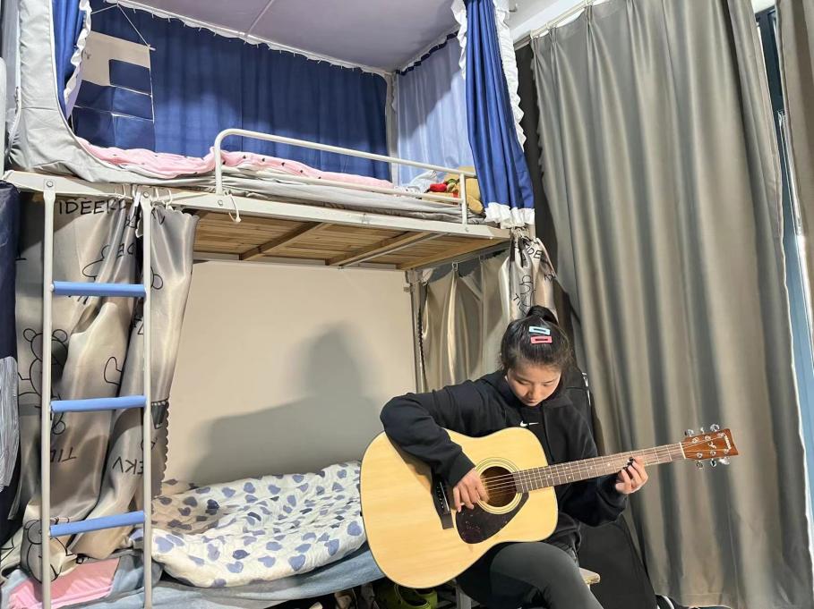 宿舍简介:该宿舍的吴安裕从小就喜欢弹吉他、唱歌,平时会自己根据流行乐进行曲谱编写,对于音乐有执着的热爱。同宿舍的段子菡对古典乐有很强的兴趣,平时也积极与段媛媛、汤小玲分享自学古典乐的心得体会。该宿舍能在课余时间互相学习弹吉他的技巧,然后进行内部弹唱比赛与点评,希望能够互相促进,陶冶情操,增进音乐鉴赏能力。