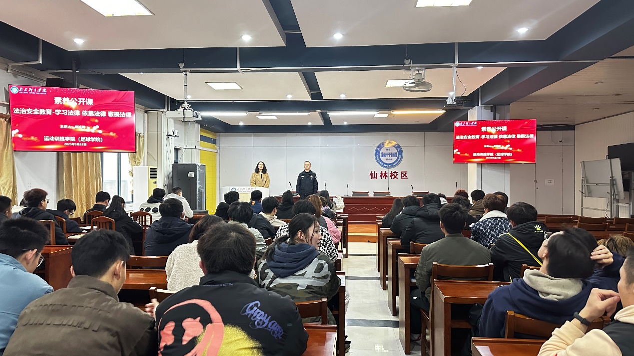 为进一步加强校园安全稳定和思想道德建设,在大学生中传播法律知识,提高大学生法治意识和法律素养。3月22日中午,运动训练学院在大学生活动中心组织开展法治安全教育主题素养公开课。邀请了南京市公安局栖霞分局仙林派出所民警姚旭峰主讲,院党总支副书记杨蓉,院团委副书记吴海艳,班主任和各年级学生代表参加会议,本次讲座由吴海艳支持。