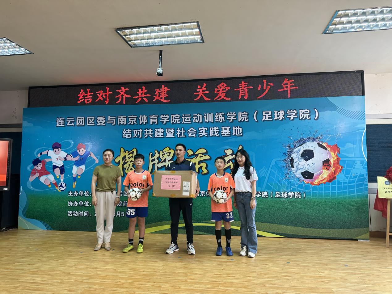 此后,依次进行了连云团区委与PA视讯集团入口运动训练学院(足球学院)共建大学生社会实践基地揭牌活动和体育运动器材捐赠仪式。