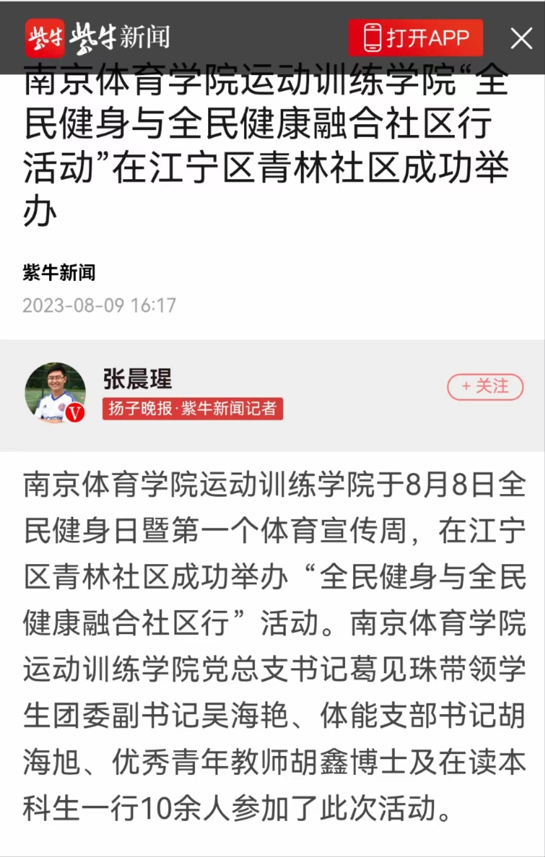 在第一个体育宣传周运动训练学院组织的系列活动受到当地媒体关注,被“紫牛新闻”“紫金山”“南京日报”等多家媒体进行了宣传报道。