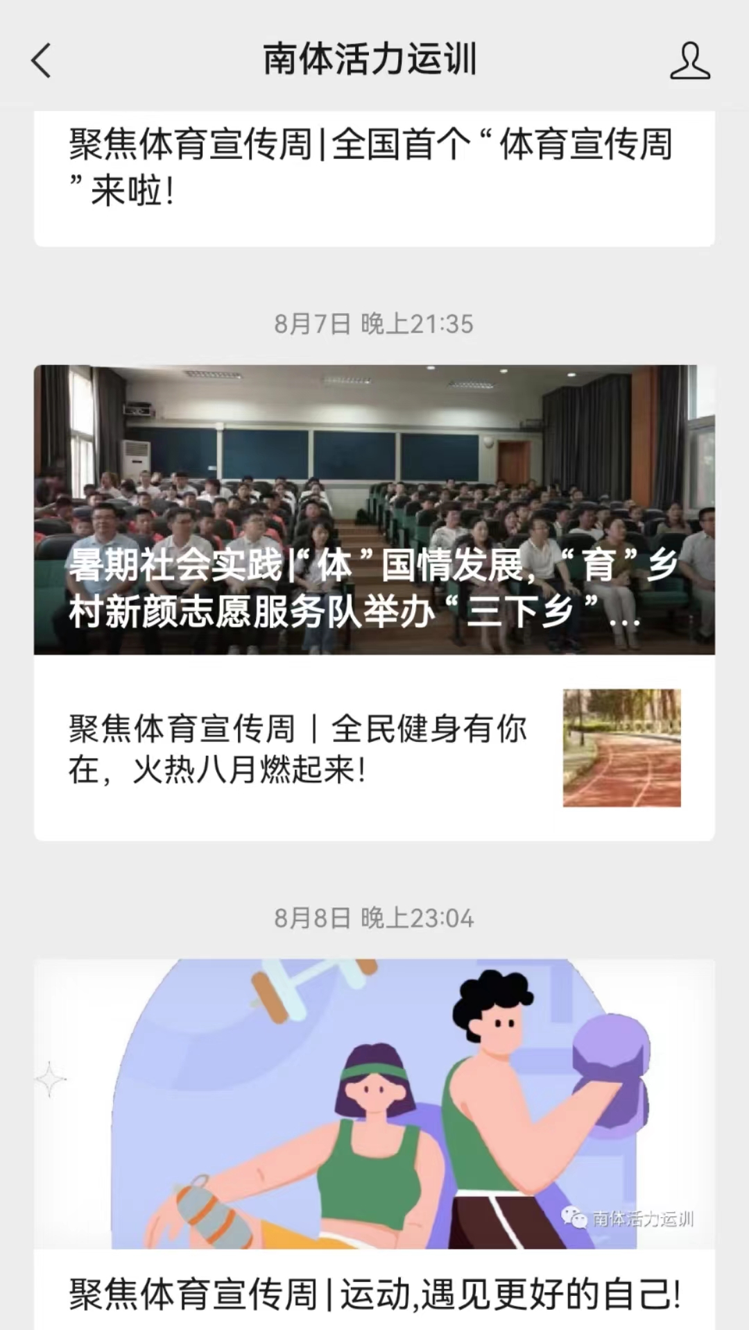从“全民健身日”到“体育宣传周”,不仅是对体育宣传工作时间、空间上的延展,更是以体育宣传周为契机,帮助人民群众树立和践行科学健身理念。为此,南体活力运训官方微信公众号于线上推出“聚焦体育宣传周”专栏,主要报道体育宣传周期间内开展的各相关活动,传递积极向上的正能量,普及健康生活与合理运动理念。同时,专栏聚焦宣传方针政策、《体育法》普法解读、体育体育精神、体育文化传播等,使健康科普巍然成风,使健康理念深入人心。
