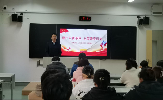 为全面贯彻落实党的二十大精神、持续推动思政课程改革创新、不断健全“三全育人”工作体系,12月8日下午,校党委常委、纪委书记、派驻监察专员周和林走进思政课堂,为运动人体科学专业大二学生讲授题为《勇于自我革命永葆青春活力》的专题思政课。