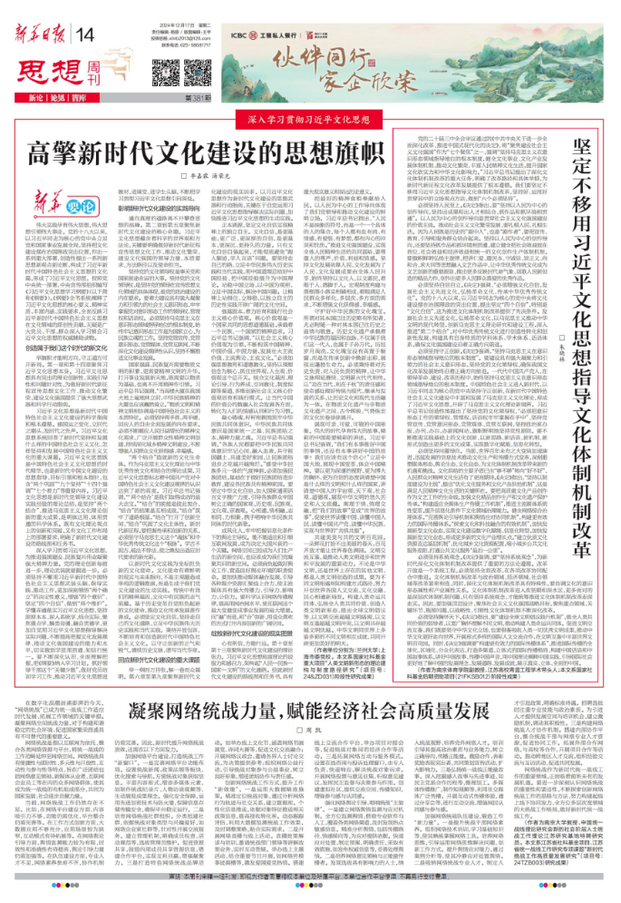 2024年12月17日,《新华日报》第14版(思想周刊)刊发了马克思主义学院副教授朱晓林的署名文章《坚定不移用习近平文化思想指导文化体制机制改革》。文章内容全文如下: