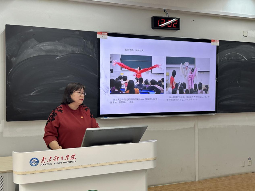 活动共有两部分。第一部分活动,由朱老师做课程思政与思政课程融合的主题报告。她结合最近走红的《豫剧艺术鉴赏》中的“水袖”、传统文化“太极拳”《唐宫夜宴》、中央民族大学舞蹈《奔腾》及中国国际时装周T台的民族非遗元素案例,与思政课程紧密结合,凝练了体育课程思政的元素,阐述了课程思政的作用和价值以及融入的具体路径等。朱老师与武术系教师面对面展开了深入的研讨与交流,气氛热烈。