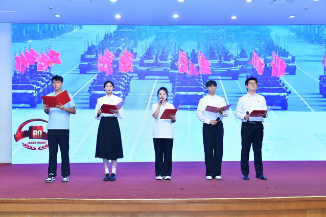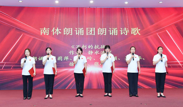 研究生代表李婷、徐雨桐、张婉琪朗诵了诗歌《青春献给新时代》,表达了将个人理想融入国家发展的青春誓言。校教师朗诵团随后演绎了《不朽的抗战》和《祖国颂南体情》两首诗歌,朗诵者声情并茂,抒发了对祖国的热爱与对母校的深情,帮助青少年树立坚定的理想信念。
