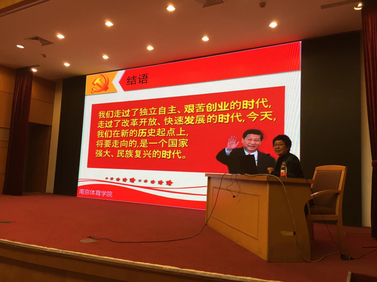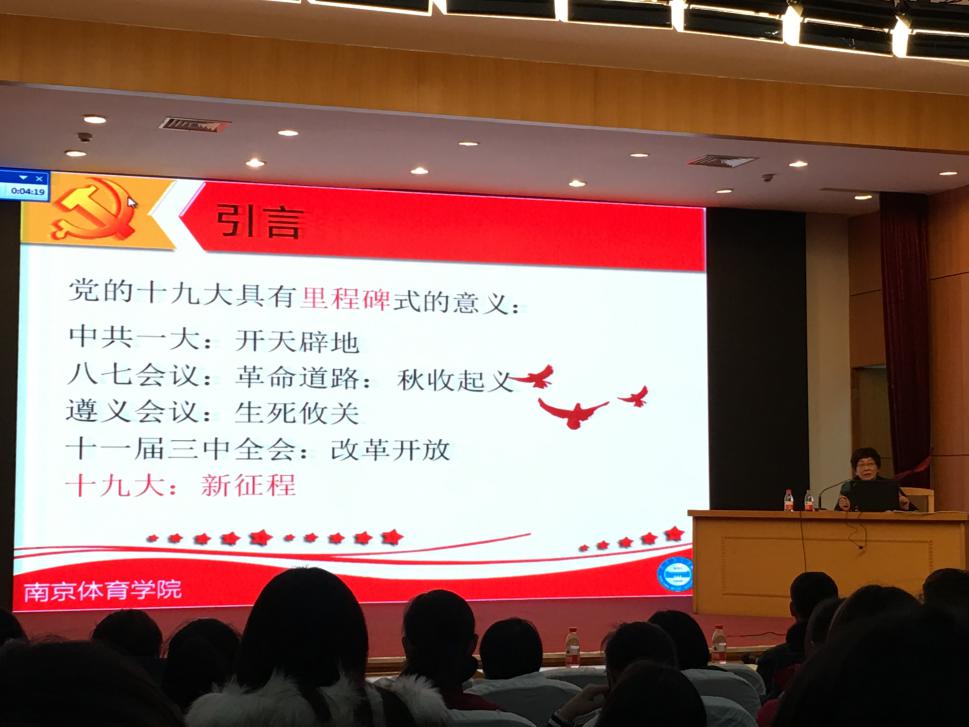 12月1日晚,PA视讯审核评估工作结束后,宣传部副部长、马克思主义学院副院长葛翠柏在校报告厅为优秀运动队两百多名干部和运动员宣讲了党的十九大精神。