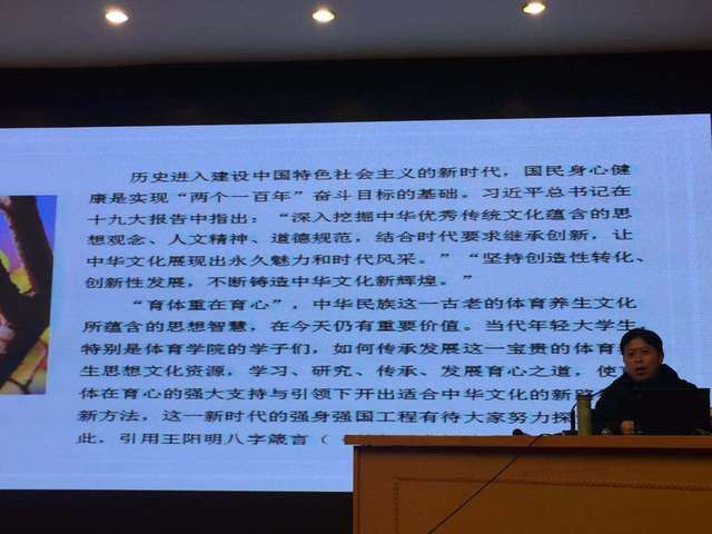 钟博士以中国传统的“体”、“育”的内涵作为切入点,详细梳理了从孔孟时期开始我国的传统的体育思想。钟博士的讲座不囿于一家之谈,他谈到了老子、庄子、孟子、《淮南子》、孙思邈、王阳明等人的传统体育养生思想,他让学生了解到,中国古代重视“育体”、“养心”,希望大学生在体育实践过程中对“育心”做应有的重视。他指出:当今已经进入了建设中国特色社会主义的新时代,国民身心健康是实现两个一百年奋斗目标的基础。育体重在育心,中华民族这一古老的体育养生文化所蕴含的思想智慧,在今天仍有重要价值。当代年轻大学生,特别是体育学院的学子们,如何传承发展这一宝贵的体育养生思想文化资源,学习、研究、传承、发展育心之道,使育体在育心的强大支持与引领下开出适合中华文化的新路径、新方法,这一新时代的强身强国工程有待大家努力探索。