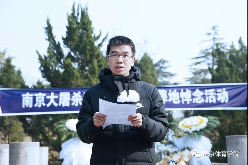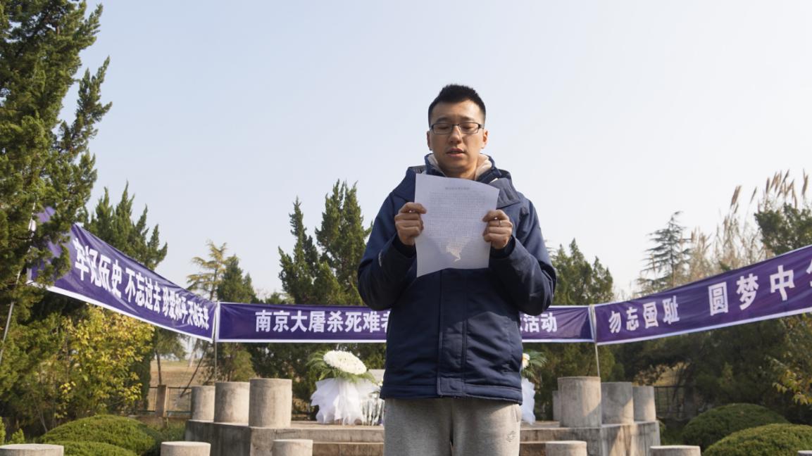 12点40分,大家在西洼子丛葬地纪念碑前肃穆站立,集体向遇难同胞默哀。青年教职工代表李俊、学生代表周策分别表态发言。李俊表示“举行国家公祭活动是要唤起人们对和平的向往和坚守,同时也是在向世界传递中华民族对于人权和文明的态度,向世界表达我们热爱和平、维护和平的决心与责任。”周策同学向在场的青年发出号召“我们要勿忘国耻、以史为鉴,坚定理想信念,在激扬青春、奉献社会的进程中书写无愧于时代的篇章。”
