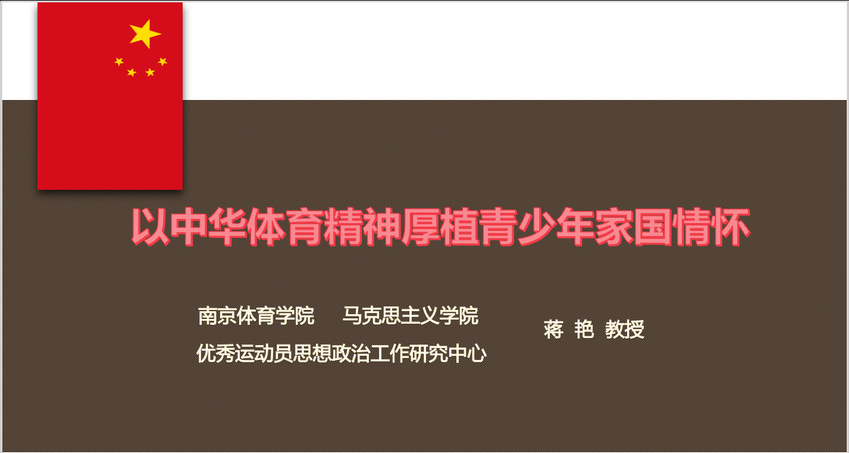 马克思主义学院蒋艳教授在会上作了题为《以中华体育精神厚植青少年家国情怀》的主题报告。从思想政治教育和体育教育的同构共建关系导入,阐释中华体育精神的内涵意蕴和时代传承,全面解读新时代中华体育精神。从历史逻辑、理论逻辑和实践逻辑论证以中华体育精神厚植青少年家国情怀的必然性,探索培育青少年家国情怀的基本路径。