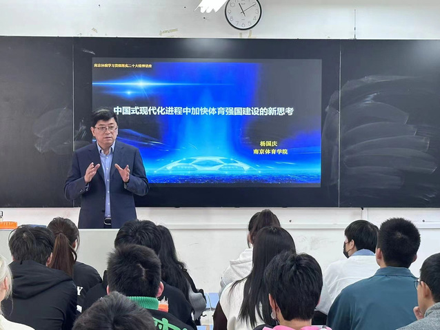 杨国庆勉励大学生要深刻学习领会党的二十大精神,在学懂弄通学深悟透上下功夫,并用二十大精神指导实践,让青春在积极投身体育强国建设的火热实践中绽放绚丽之花。授课过程中,学生积极提问,并被给予了详细解答,从而扩展了体育强国知识,提升了学生思想认识,对学生更好理解党的二十大精神,把握体育强国建设规律,起到了重要的引领作用。
