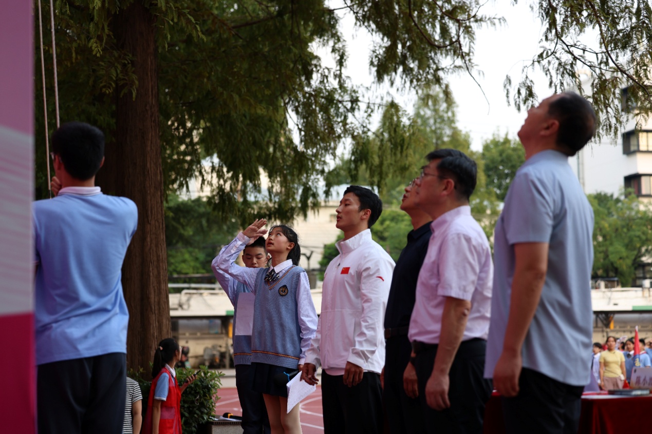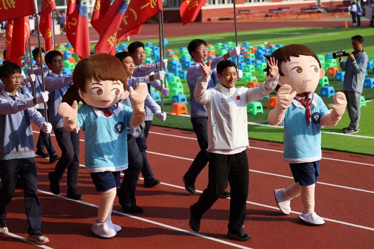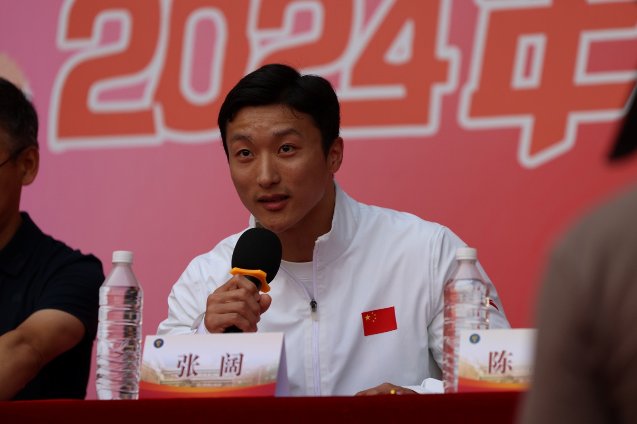 临近中华人民共和国成立75周年,五十四中的校园里国旗飘飘,彰显着浓浓的节日氛围。运动会开幕式伊始,张阔带领着运动员方阵,迈着铿锵有力的步伐走进田径场,象征着世界冠军运动精神的传承。入场式结束后,张阔以“那些年,体育教会我的”为题发表演讲。他带领大家回顾了自己十几年的竞技运动生涯,分享了从体育中获取的强大力量,尤其是在面对运动生涯的一个个挑战中培养出来的专注及快乐,让他能够从容面对生活的挑战。他鼓励同学们积极参与体育运动,单纯而热情地享受身体活动带来的乐趣。演讲获得了同学们的积极响应。