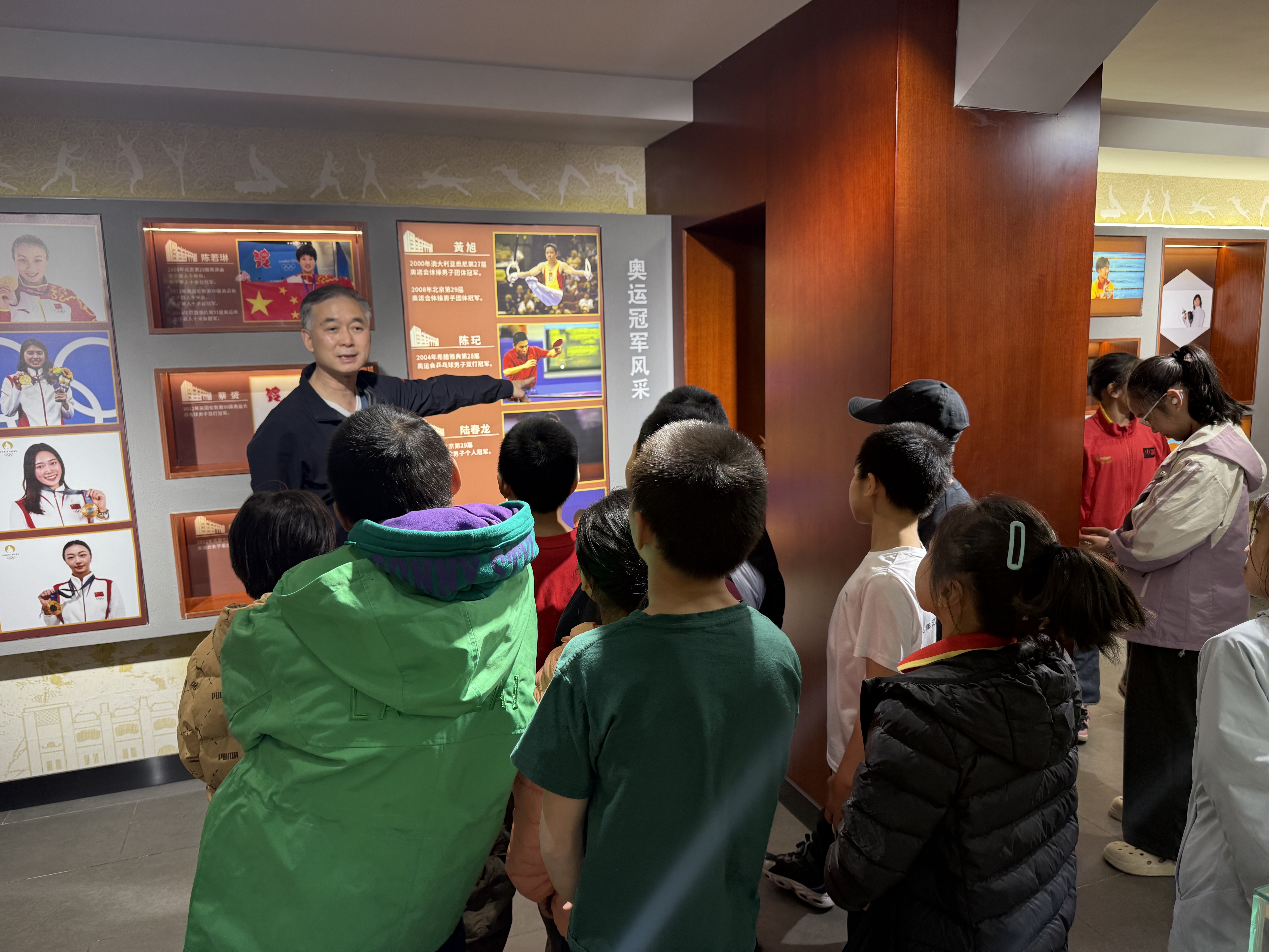 4月4日,体操学院党总支书记谢长虹、体操学院关工委常务副书记丁习明带领运动员参观校史馆。