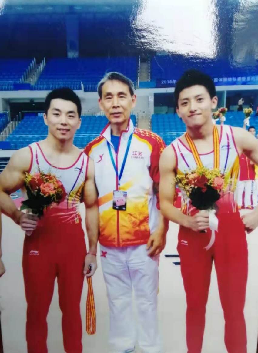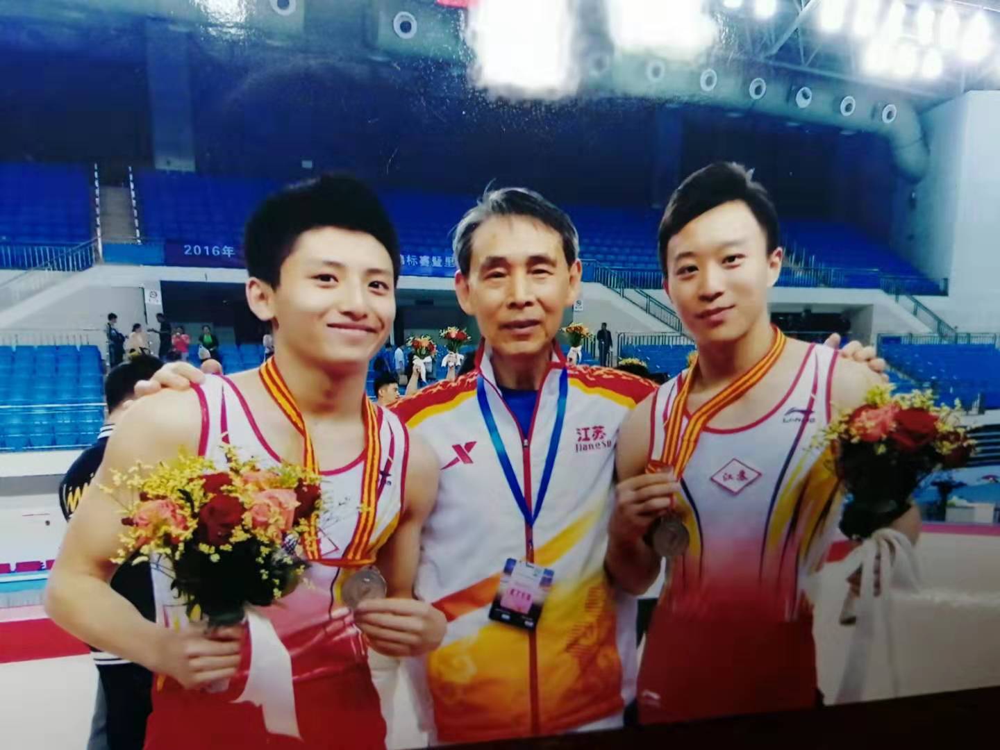 在 2016年全国体操锦标赛中,江苏体操队荣获男子团体冠军、翁浩荣获鞍马冠军。这是尤啟骏教练在赛后与爱将尤浩与翁浩的合影。