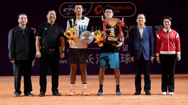 9月26日,2020中国网球巡回赛CTA1000长沙望城站收官之日在月亮岛法网罗兰·加洛斯红土网球公园圆满落幕。我院球员张择/华润豪对阵高鑫/孙发京,以3-6/6-2/10-2(抢十)逆转取胜,夺得男双冠军;张择以6-7/6-7惜败吴易昺获得男单亚军。