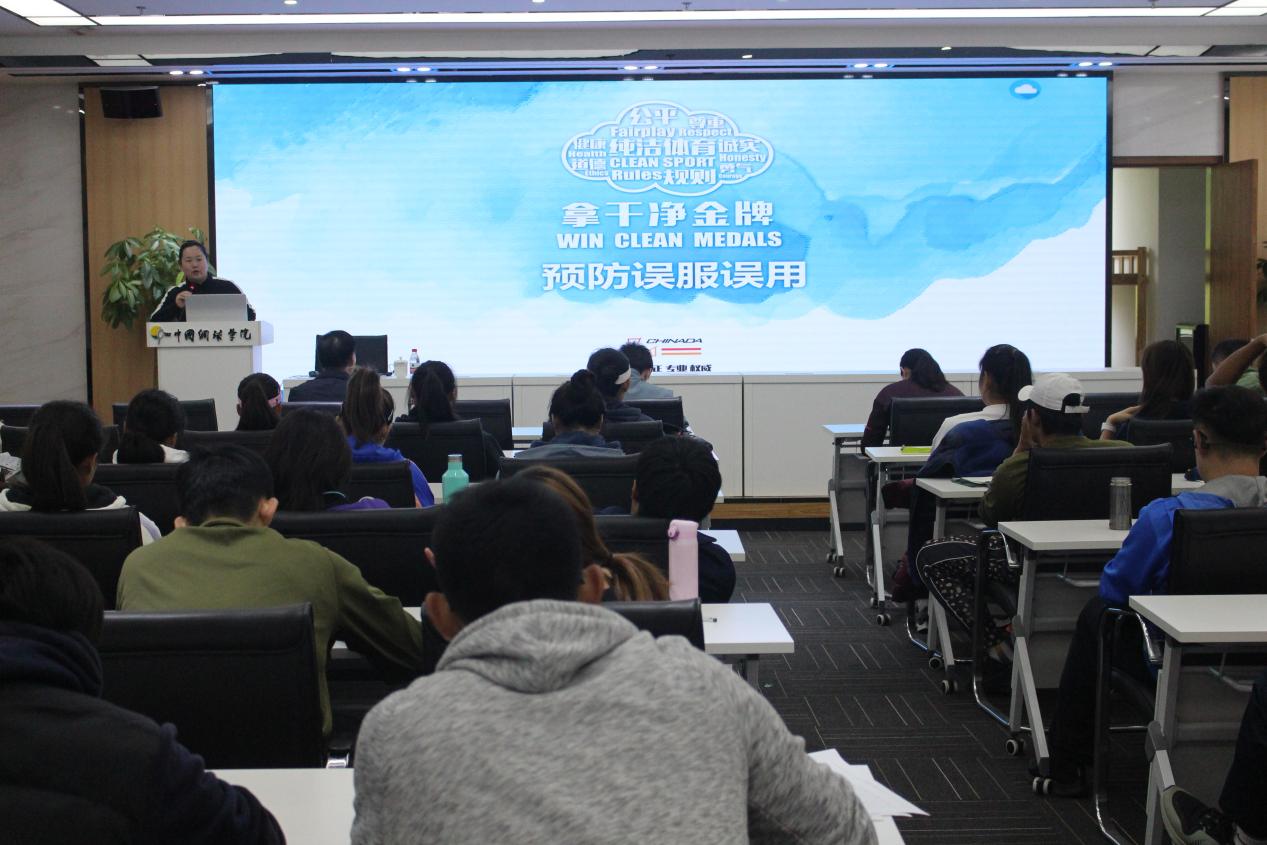 会议邀请了江苏省体育局省级反兴奋剂讲师、江苏省女子柔道队队医支珊珊老师,针对网球学院的实际,为全体参会人员作“拿干净金牌”的专题授课,重点在预防误服误用、做好行踪报告两个部分。