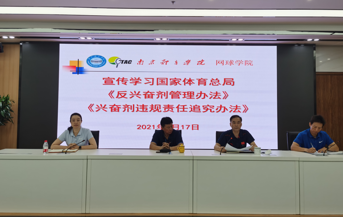 为全面贯彻落实习近平总书记关于反兴奋剂工作的重要指示批示精神,加强反兴奋剂法治建设,全面规范和强化反兴奋剂工作,贯彻落实坚决拿道德的金牌、风格的金牌、干净的金牌,努力做到兴奋剂问题零出现、零容忍。2021年8月17日,网球学院组织召开反兴奋剂学习会,宣传学习新修订的国家体育总局《反兴奋剂管理办法》、《国家体育总局兴奋剂违规责任追究办法》,全体管理干部、教练员、运动员、科医及辅助人员参加会议。会议由网球学院院长鲍勤主持。