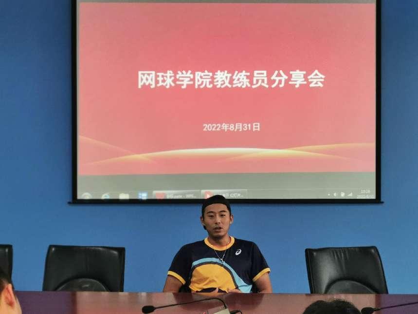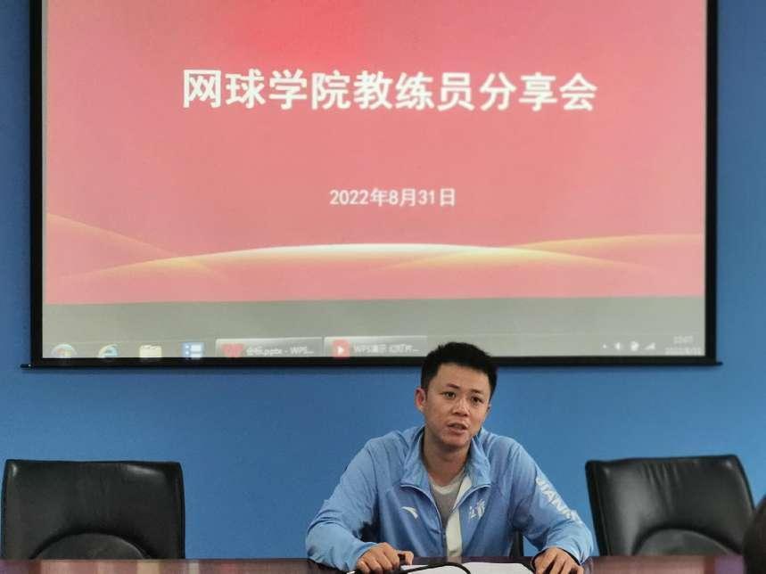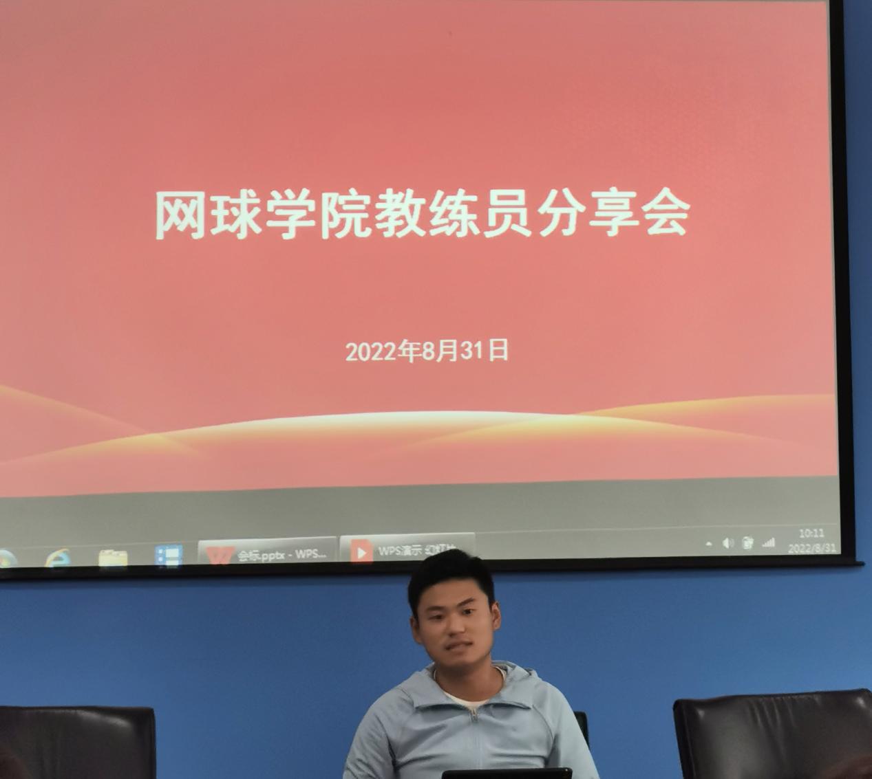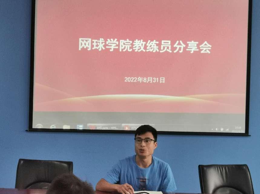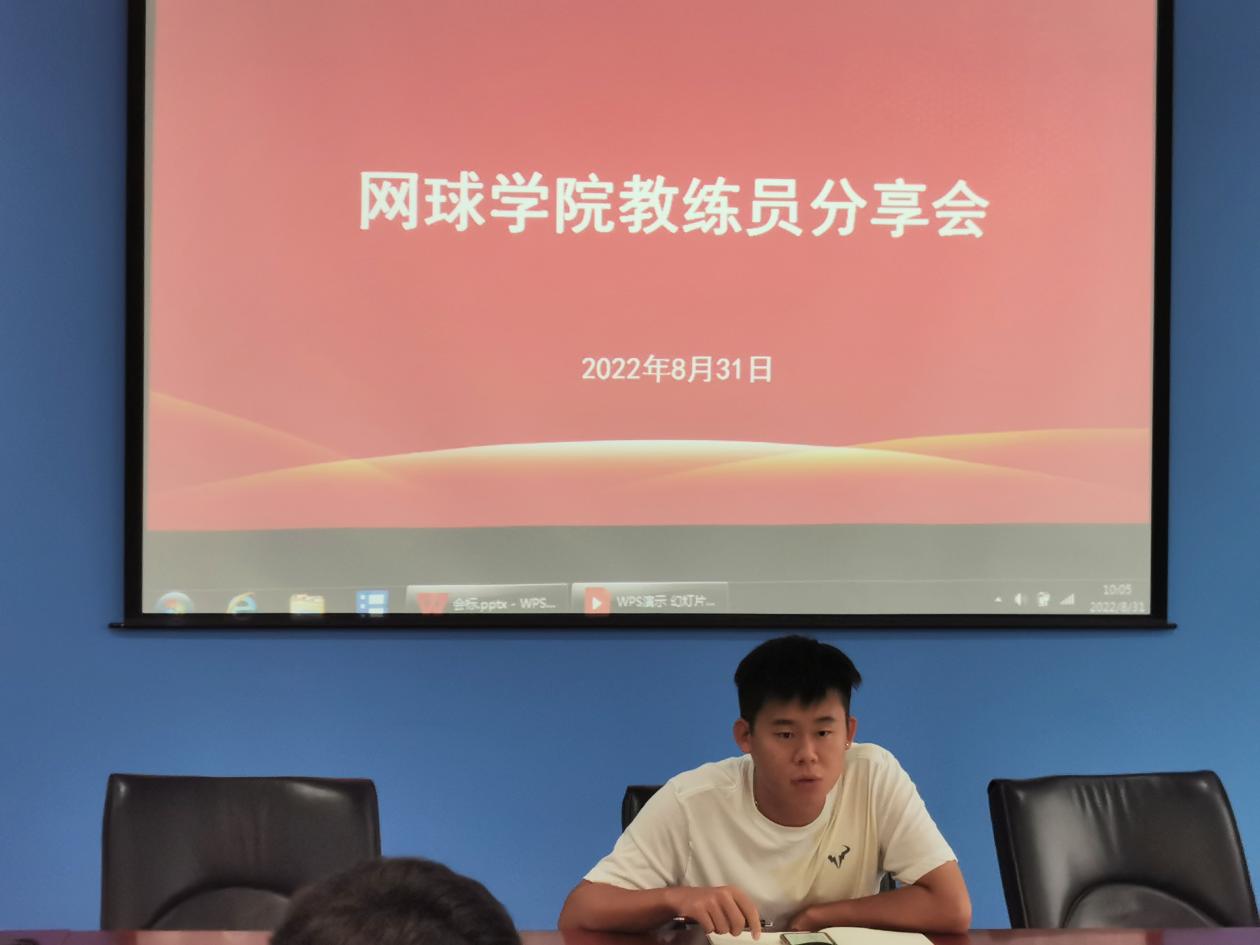 为加强网球队教练员队伍建设,提高教练员执教能力,进一步扩大外出学习培训的效果,实现学习成果共享,8月31日,网球学院在澳网厅召开了教练员外出学习分享会,网球学院院长鲍勤和网球队全体教练员出席会议。会议由鲍勤院长主持。