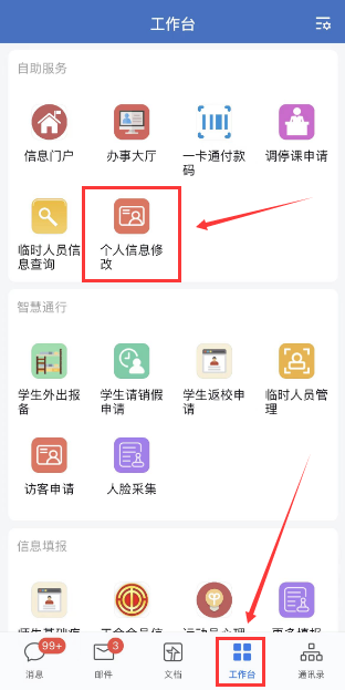 点击企业微信“工作台”的“个人信息修改”,进入“个人中心”修改密码。