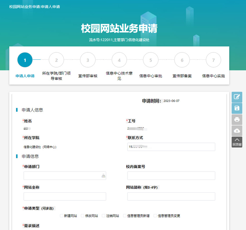 二、服务简介:各单位、部门负责本部门网站内容管理,需指定一名网站信息起草员负责网站内容起草与维护,指定一名管理员负责内容审核与发布,如因工作调整需要变更起草员与管理员,需使用此服务在线提交申请,经宣传部、信息化建设处审批通过后实施调整。