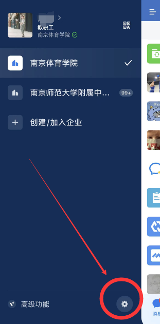 在“消息”菜单栏下点击左上角的三条横线,会显示自己目前加入的企业列表,点击右下角的“设置”图标,再点击“管理企业”,可以进入企业管理页面。