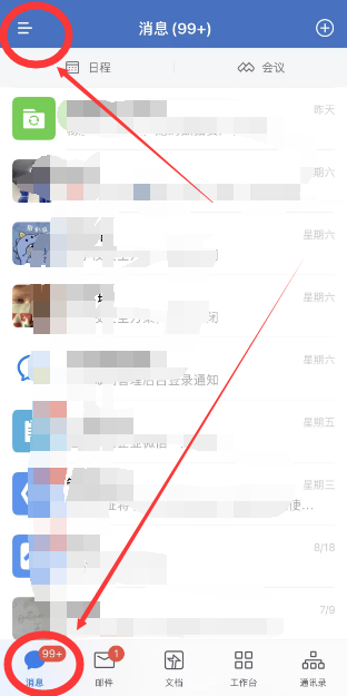在“消息”菜单栏下点击左上角的三条横线,会显示自己目前加入的企业列表,打钩的企业表示自己目前正在登录和查看的企业,点击对应的企业名称,可以切换至对应的企业。