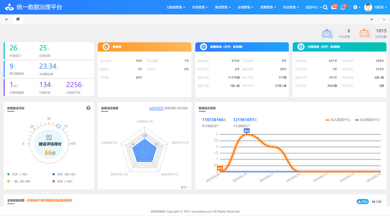 数据治理平台主要为解决校内孤岛数据的统一汇集以及高质量数据共享需求。平台是一个校级的数据基础管理中心,承载着高校全局的数据理解、管控,平台依托校级的统一信息标准和数据流向作为建设基础,建立一个校级权威的全量数据中心。截至目前信息化建设处已实现与全校26个系统、9个数据域134张表入库,共143张数据字典表的归集工作,每日数据活跃度达到数千万级别,各类业务基础数据储量1.2亿+。基本实现覆盖“人、财、物”和“教学、财务、资产”等校级全域数据资产,提升的学校管理精准化、教学智慧化、服务高效化建设水平。