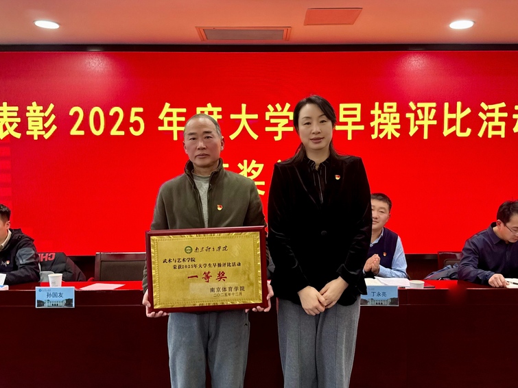 党委常委、副校长鲍勤为2025年大学生早操评比活动“一等奖”武术与艺术学院颁奖