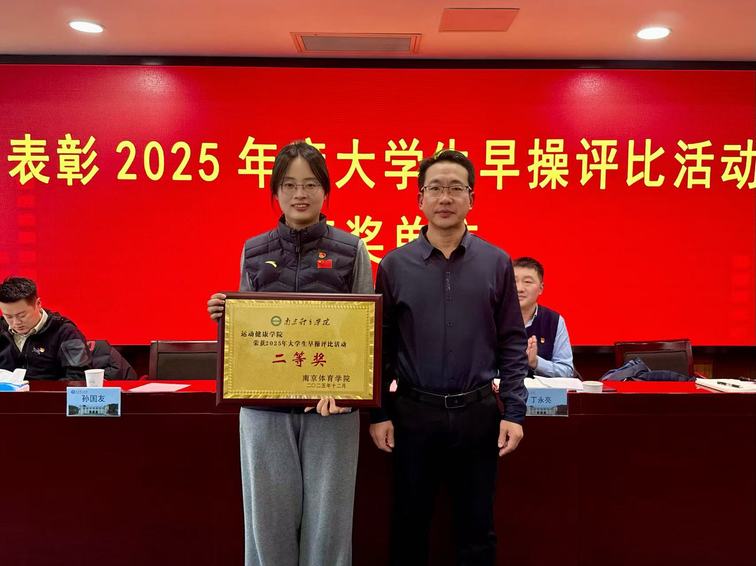 教务处处长王凯为2025年大学生早操评比活动“二等奖”运动健康学院颁奖