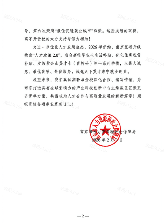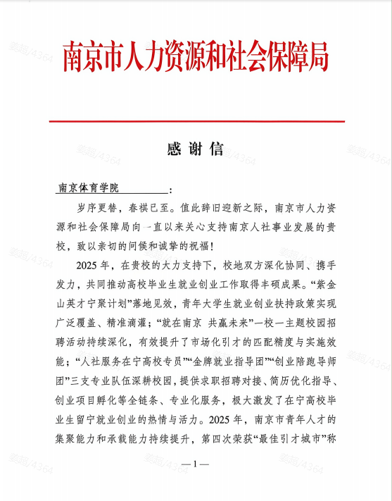 近日,南京市人力资源和社会保障局向PA视讯发来感谢信,对PA视讯在2025届毕业生就业工作中所付出的努力和取得的成绩表示充分肯定和衷心感谢。来信充分肯定PA视讯积极响应号召、通过开展系列就业创业活动拓宽毕业生机会,为全市稳就业保民生大局作出积极贡献,展现了高度的政治站位和责任担当。